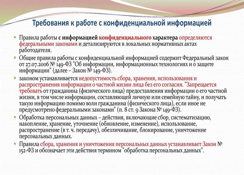 Правила обращения с информацией конфиденциального характера закреплены в ряде федеральных законов, среди которых ключевое место занимает Федеральный закон от 27.07.2006 № 149-ФЗ «Об информации, информационных технологиях и о защите информации». Этот нормативно-правовой акт: